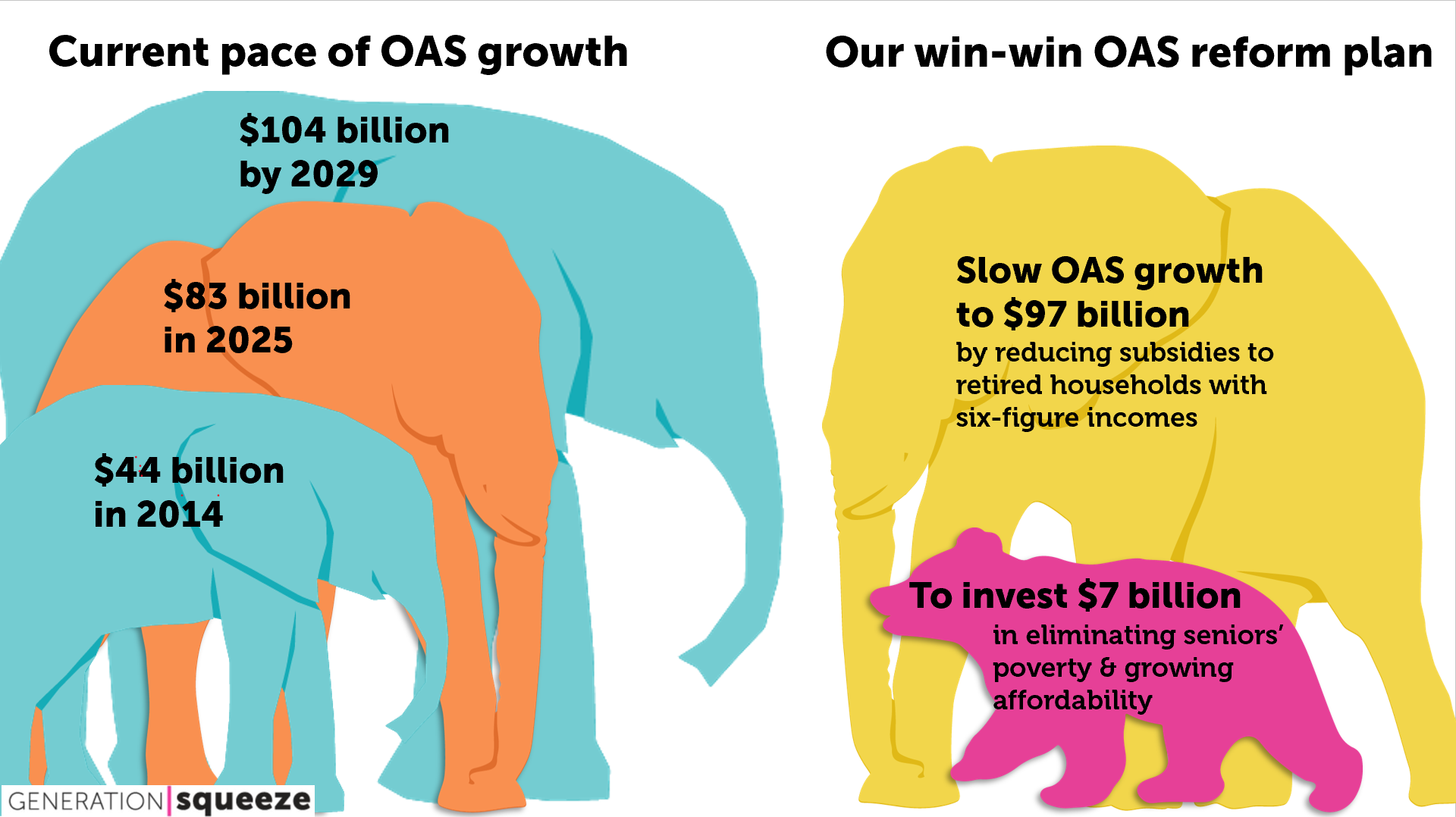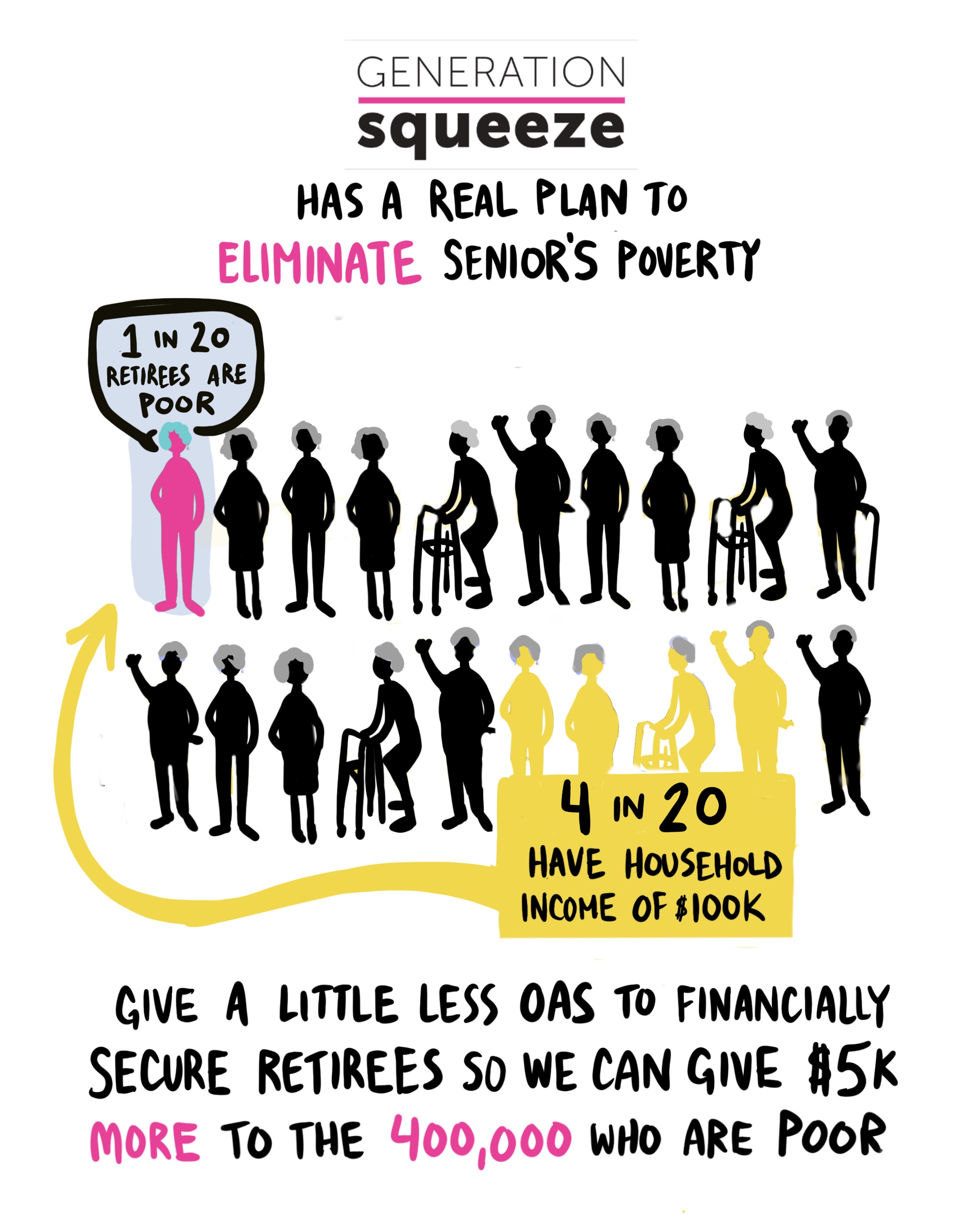 Three in four Canadians back a simple fix: modernize Old Age Security to eliminate seniors’ poverty, help younger Canadians get ahead, and shrink the deficit – all without raising taxes. We can get there by asking the 1 in 5 retirees with household incomes above $100,000 to accept a bit less from OAS.