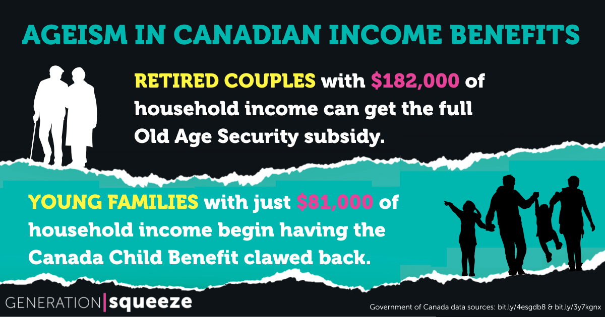 Old Age Security is more generous than other income supports in Canada. A retired couple with $182,000 of income still gets full OAS benefits, while young families have the Canada Child Benefit clawed back at $81,000 - even though seniors have the lowest rates of poverty of all age groups, and enjoy the most wealth. It's time to end this structural ageism against younger people.