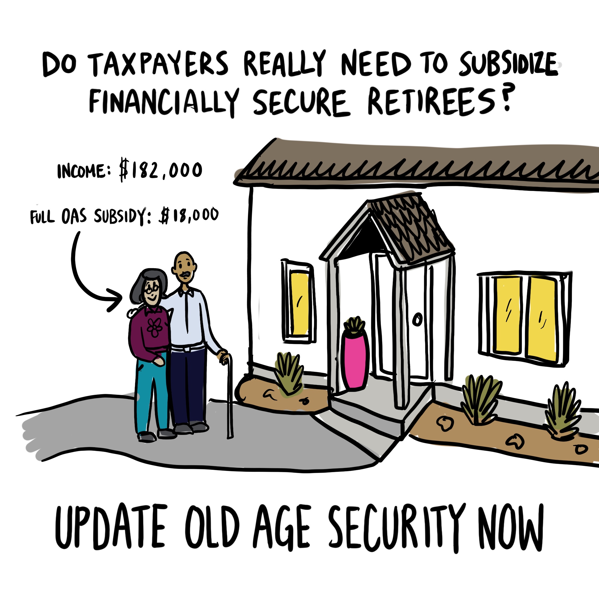All Canadians deserve to be financially secure, including our aging loved ones. But it's not hard to imagine better ways to address affordability pressures than giving 18,000 annual OAS subsidies to couples with incomes more than 2.5 times the median household income. If we give slightly less to financially secure retiree households, we can invest more in lifting seniors out of poverty, and supporting young and working people to cope with rising costs.